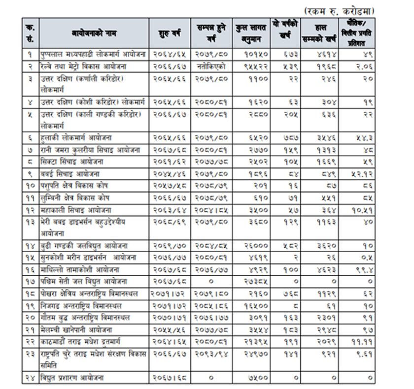 यस्तै, पशुपति क्षेत्र विकास कोषको प्रगति ८६ र लुम्बिनी विकास कोषको प्रगति ८५ तथा पोखरा क्षेत्रीय अन्तर्राष्ट्रिय विमानस्थलको काम ६२ प्रतिशत सकिएको छ । पश्चिम सेती जलविद्युत आयोजना र प्रसारण लाइन निर्माण आयोजनाको काम त शून्य प्रतिशतभन्दा माथि उठ्नै सकेको छैन ।
