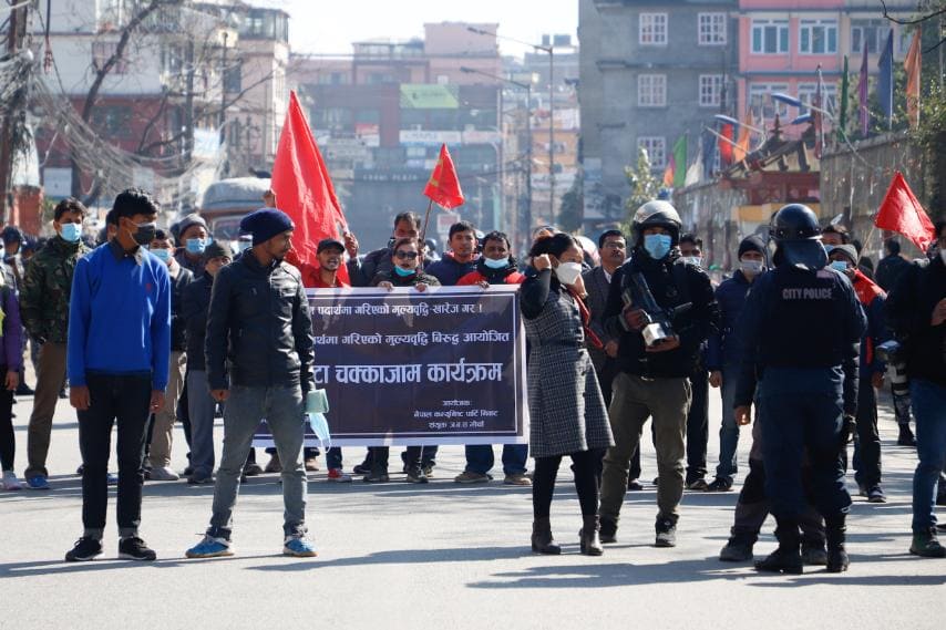 नेत्रविक्रम चन्द नेतृत्वको नेपाल कम्युनिष्ट पार्टी निकट जनबर्गिय संगठनहरुले पेट्रोलियम पदार्थमा निरन्तर भईरहेको मूल्यबृद्धीको बिरोधमा काठमाडौंमा प्रदर्शन गरेका छन ।