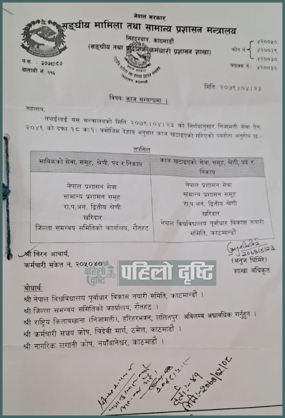 साउन २३ नेपाल विश्व विद्यालय पूर्वाधार विकास तयारी समिति काठमाण्डौमा काज सरुवा गरेको पत्र