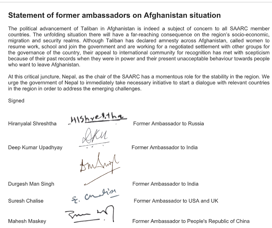 अफगानिस्तानबारे ५ पूर्वराजदूतको वक्तव्य : सार्क अध्यक्षको हैसियतले नेपालले भूमिका खेलोस्